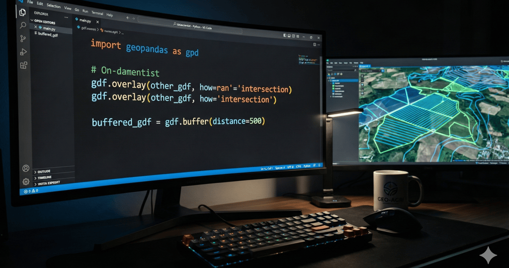 No Código Rural, nós abandonamos essa sofrência. Para auditorias de larga escala (Big Data Territorial), nós usamos Python com a biblioteca GeoPandas.